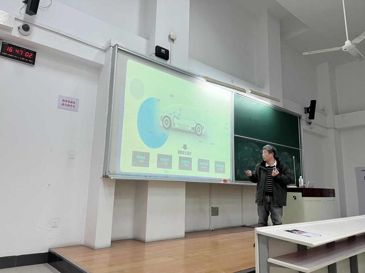 2025年11月24日上午,材料科学与工程学院专业硕士《材料与化工前沿课程》课程邀请悠跑科技有限公司技术总经理热岛走进课堂,在A315教室为研一同学讲授了“汽车制造的模块化革命”。
