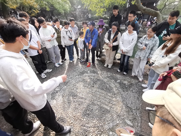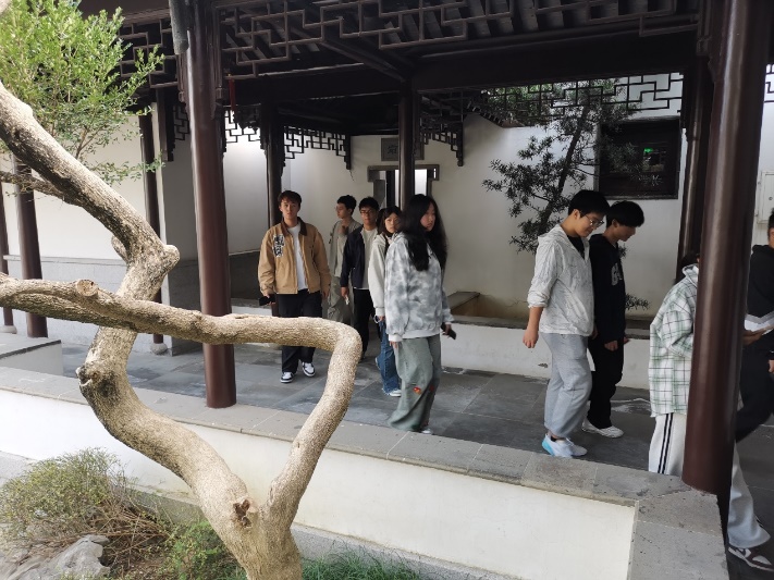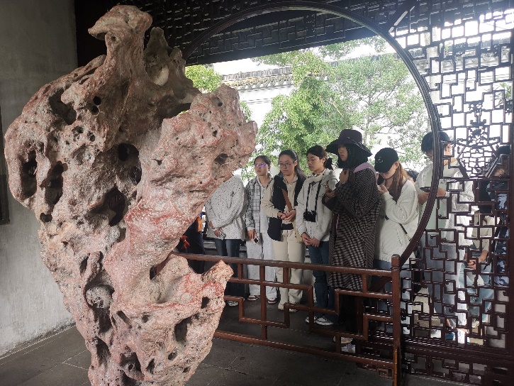 随后,学生们来到拙政园和山塘街,在青砖黛瓦、小桥流水间感受苏州古城的肌理。园林中窗棂的纹样、假山的堆砌技法、建筑结构的榫卯连接,都成为学生们现场讨论的焦点。这些传统建筑中材料的运用与搭配,展示了古人对材料属性的深刻理解。