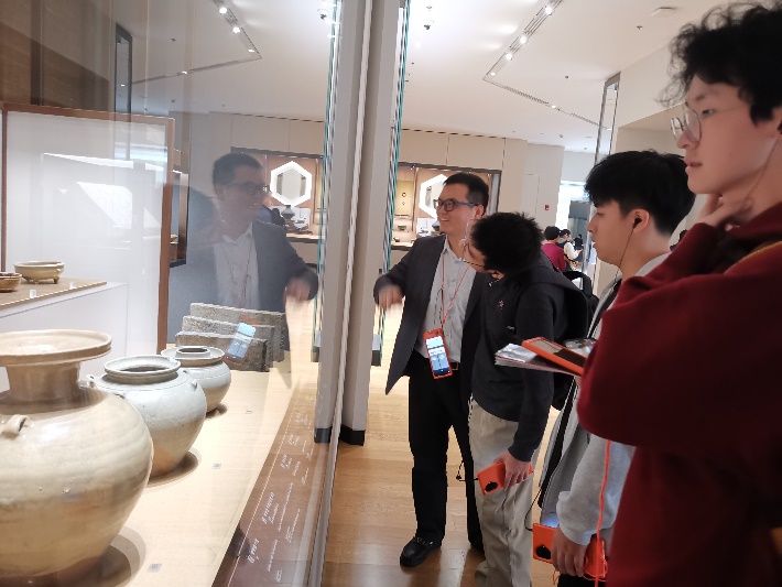 在苏州博物馆,学生们不仅欣赏了文物,还特别关注了博物馆建筑本身材料的运用。博物馆建筑外立面和内部墙体选用葡萄牙灰石材,自然独特的纹理,扎实稳定的材质,使得场馆外观轻奢有度、气韵十足。而“十个盒子”建筑单体的组合与廊道交错,又与苏州水陆并行的街巷、江南错落有致的民居不谋而合。