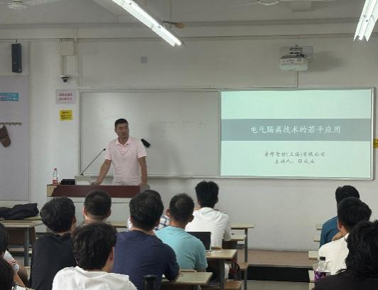 2025年10月11日上午,材料科学与工程学院集成电路科学与工程专业方向《先进封装技术》课程邀请上海普邦智控有限公司邵成业专家走进课堂,在教学楼C210为集成电路科学与工程的研一同学贡献了一节以“电气隔离技术的若干应用”为主题的精彩课堂。课堂上,邵专家主要从四个方面给同学们讲述了隔离技术。一.隔离技术在自动化领域的若干应用研究。邵专家从小到日常生活中身边的例子充电器,大到国家航天技术的应用来介绍隔离技术,让学生们更快的了解到隔离技术是什么,怎么用,以及隔离技术的存在意义。二.隔离变压器若干技术与工艺。邵专家介绍了在隔离技术中用到的主要设备隔离变压器,包括变压器的发展历史,变压器的种类,变压器在设计过程中用到的工艺和技术等等,变压器在制造的过程中会有很多难点,比如电路的设计,保险丝的选择,材料的选择,一个小小的变压器集成了多个模块,拥有复杂的电路,设计一个变压器要有一个强大的理论基础,各个模块在变压器中的连接都需要复杂的电路去承接,不同的变压器所用到的技术还有所区别。邵专家展示具体的实物让学生对变压器的结构有了进一步的了解。三.变压器磁芯材料主要特征参数。邵专家更深入的讲解了变压器的核心